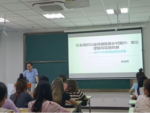 史剑辉博士在k202作题为“社会组织公益传播助推乡村振兴:理论逻辑与实践机制——基于行动者网络理论视角”的讲座,学院师生参加。