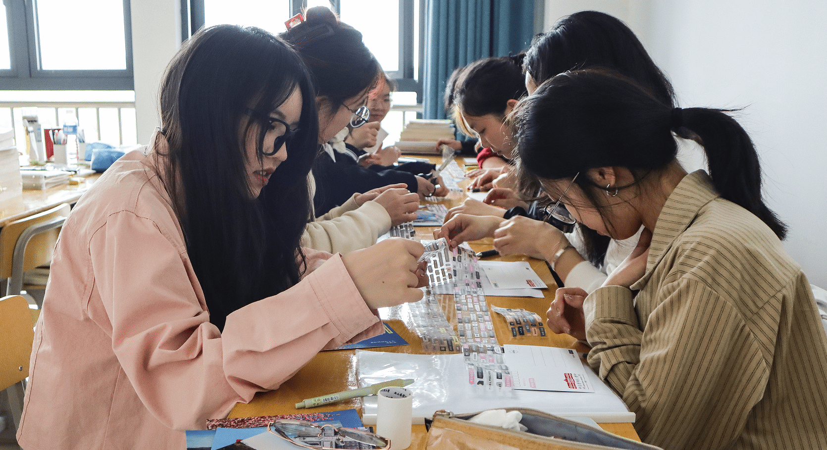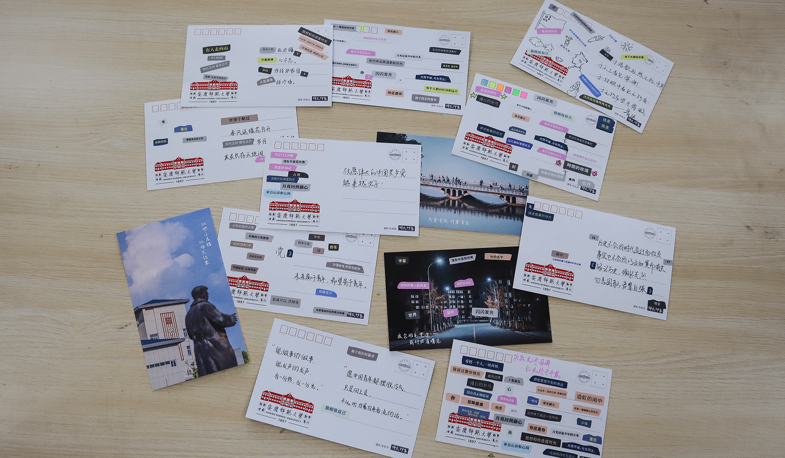 低头沉思、挥毫泼墨、轻声诵读……学生们自主选取诗歌素材,通过裁剪拼贴的方式,将诗句粘贴在明信片上,最终创作出各具特色的拼贴诗,在诵读中表达对革命先烈的崇敬与怀念。