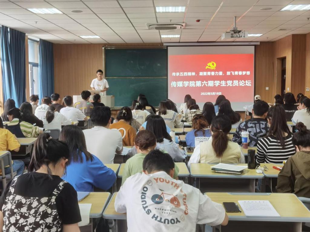 于K505教室举办第六期学生党员论坛,围绕“传承五四精神,凝聚青春力量,放飞青春梦想”主题,分享青春故事。,全体学生党员参加了论坛。学院团委书记、广播电视学学生党支部书记董小雨主持论坛。