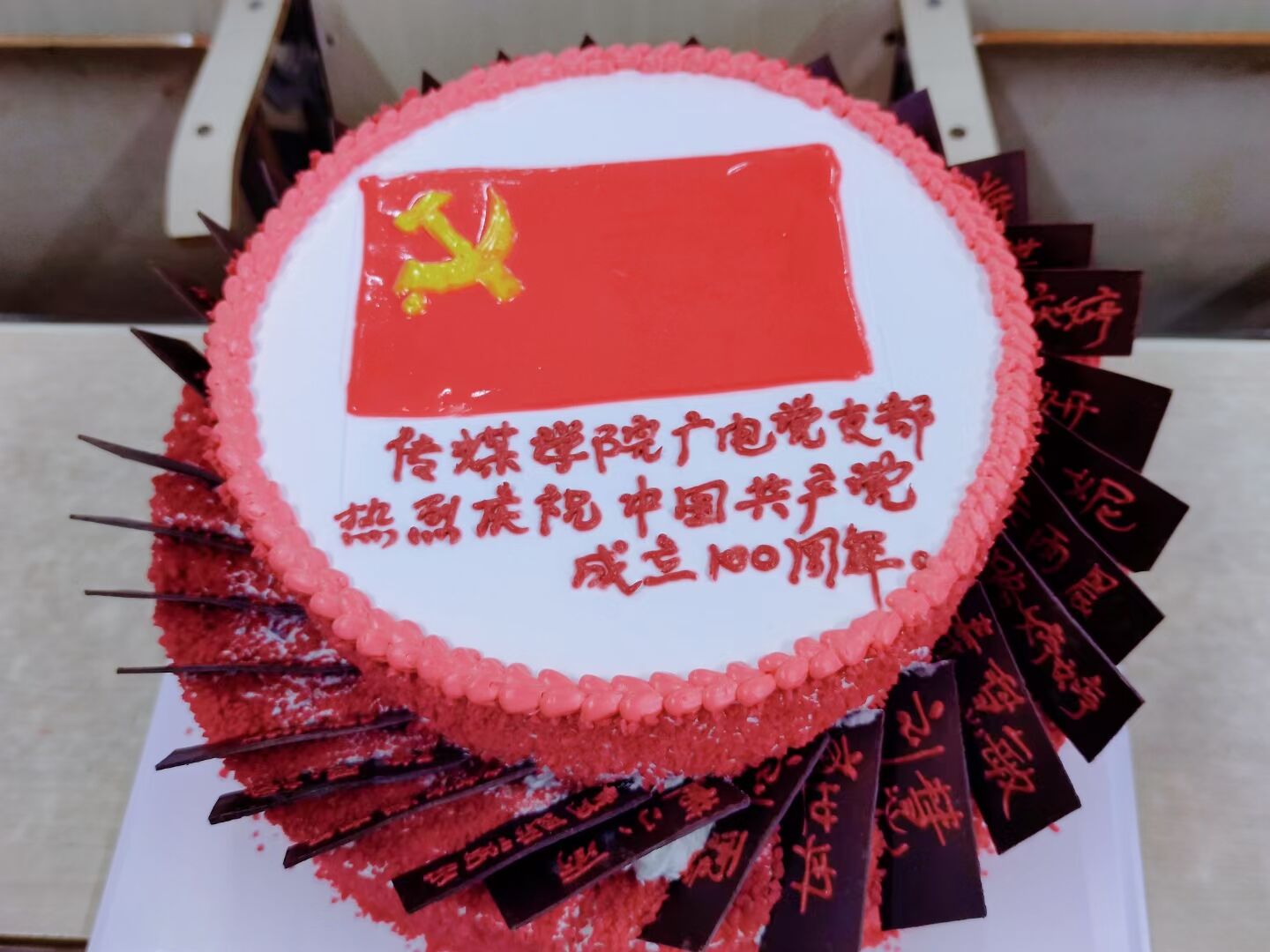 定制蛋糕上绘制了党旗,并用一块块巧克力写下党支部所有党员名字, “没有中国共产党,就没有新中国,我们现在的幸福生活是靠无数革命先烈用自己的鲜血换来的,今天对于每一位中国共产党党员来说都是很重要的日子,我们要时刻铭记。”支部老师董小雨说。