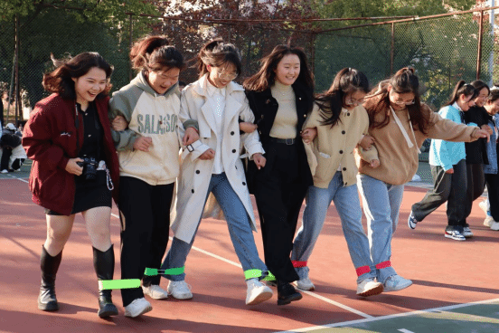 各支队伍在比赛中进行比拼,活动现场氛围热烈。一根绑带将六人的脚系在一起,连接的是友情,考验的是默契。新闻传播学类2023(7)班的潘芮说:“在比赛中,我们需要大喊‘一二一’的口号,这样我们才能步调一致,一起配合向前走。”她说,原本不熟的同学也在比赛过后渐渐熟络起来,大家都在比赛后对彼此有了更深的了解。