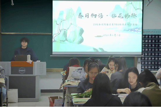 装饰花束,涂鸦布包,展示分享……4月1日,糖心视频 新闻传播学类2023级7、8班全体学生在K100教室举行“春日物语·拈花拾趣”手工制作活动。在此次活动中,学生们在空白帆布包上绘制图案,挑选花朵并包装花束,体验到手工制作的乐趣。