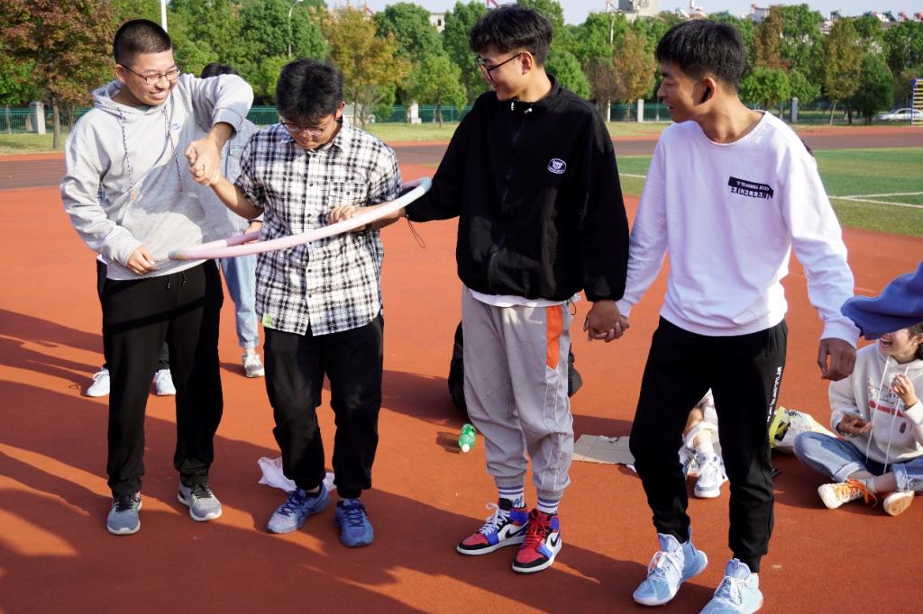 在“传呼啦圈”环节中,七人组队手牵手,小组成员逐个穿过呼啦圈实现传递,最后一位传递者需要将呼啦圈转三圈。由于身高较高,新闻传播学类专业2021(5)班的张翔宇在传递呼啦圈时被卡住。“我平时不经常接触呼啦圈,在传递的过程中耽误了一些时间。”他表示,虽然没有赢得游戏,但他加深了与同学们之间的了解。