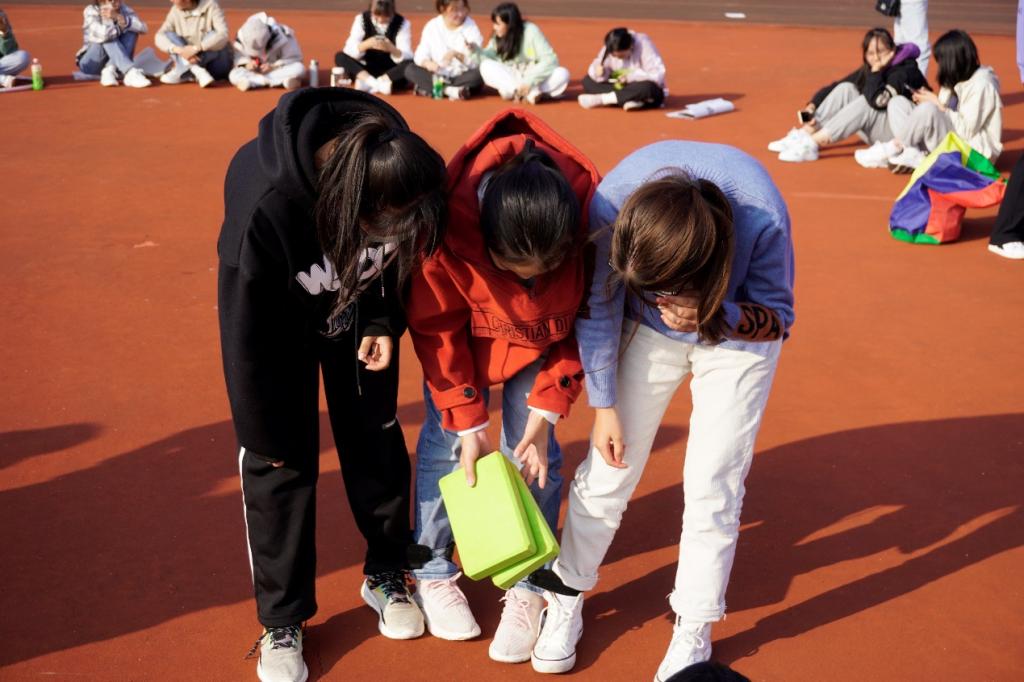 “开始”口令下达后,学生手挽手,相互扶持走向终点。随机组队的三位女生最先到达终点,她们不约而同地欢呼起来。当谈到小组如何做到快速行动时,她们说:“我们虽然是第一次见面,但是很快便达成了一致意见,轻松地完成了考验。”