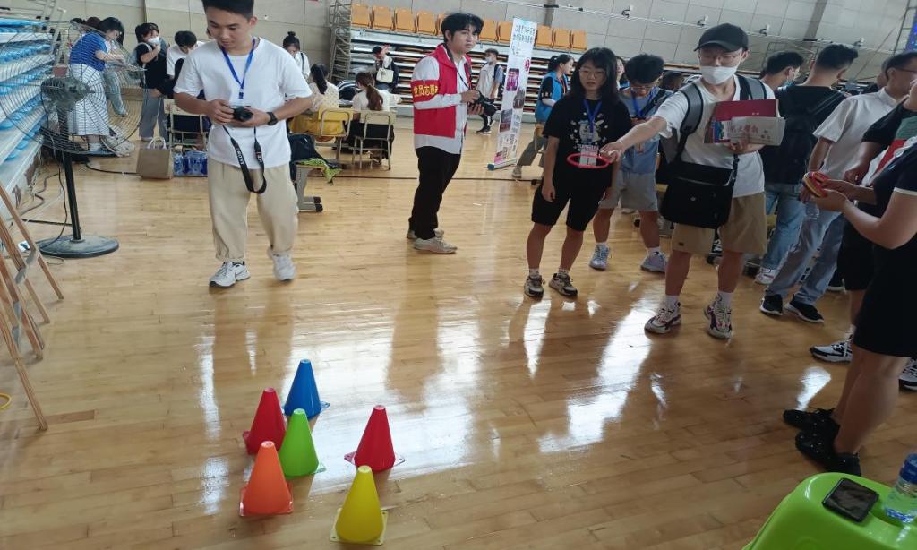 “每人五个套圈,投中即可得到学院吉祥物‘传小团’的立牌。”马帅向新生介绍套圈游戏规则,“我们设计游戏环节的目的是想增加新生的体验感,同时也给他们留下一个特殊的入学经历。”