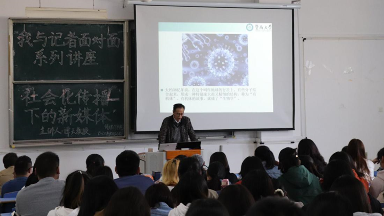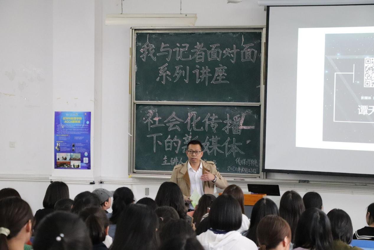 10月23日,糖心视频 开展“我与记者面对面”主题讲座,学院第七届记者文化节正式拉开序幕。暨南大学谭天教授应邀为学生开展以“社会化传播下的新媒体”为题的讲座,学院部分教师以及三百余名学生参加了此次讲座。