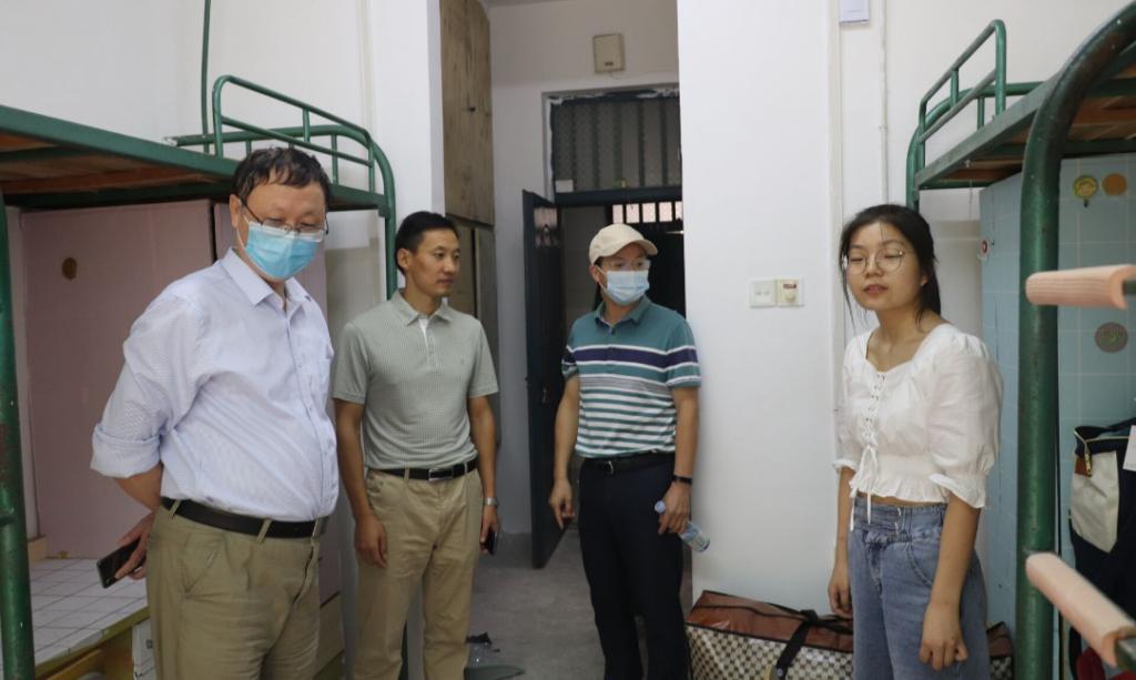 党总支书记韦长发、院长马俊、党总支副书记张万茂、新生辅导员来到学生宿舍看望新生。