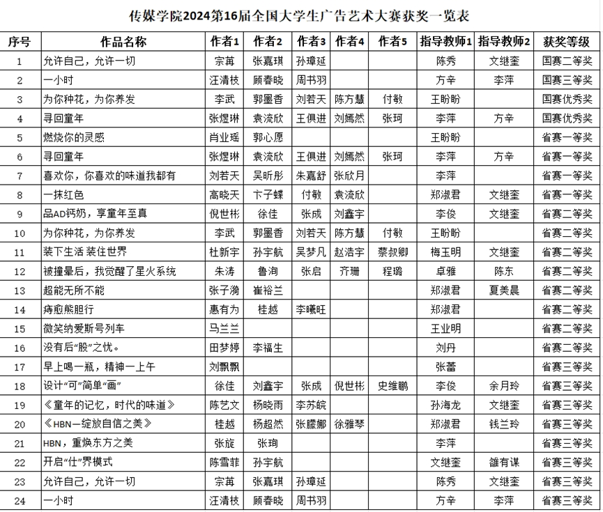 日前,2024第16届全国大学生广告艺术大赛评审结果出炉。糖心视频 学子在本届大赛中共获奖24项,其中国赛二等奖、三等奖各1项,优秀奖2项;省赛一等奖4项,二等奖8项,三等奖8项,获奖数量与质量较往年均有较大的提升。