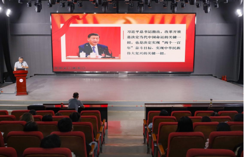演播厅,王业明向全体2025届毕业生开展学习贯彻党的二十届三中全会精神宣讲,他强调,大学生群体是有力推进中国式现代化强国建设、民族复兴伟业的重点群体、时代发展需要青年力量,全体毕业生要带头深入学习领会、坚决贯彻落实党的二十届三中全会精神,在实习和就业岗位上履行好“讲好中国故事,传播中国声音”的时代责任。