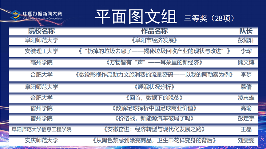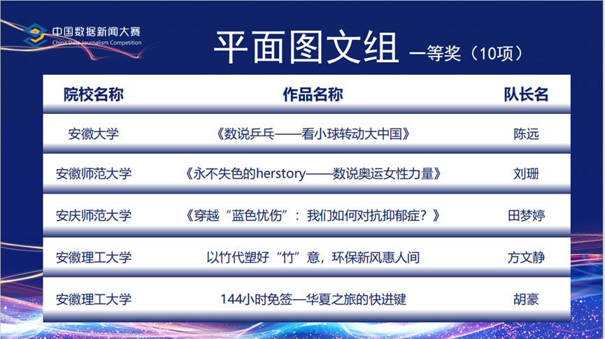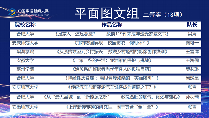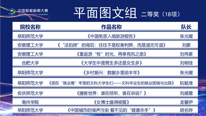 、新闻传播国家级实验教学示范中心(安徽大学)承办,旨在推动安徽省高校新闻传播学类专业的发展与创新,同时挖掘和培养数据新闻领域的优秀人才。据悉,本次大赛吸引了全省16所高校的广泛参与,共收到参赛作品200余件,经由来自省内6所高校专家双评、安徽赛区组委会复审核查,共65份作品入围决赛。