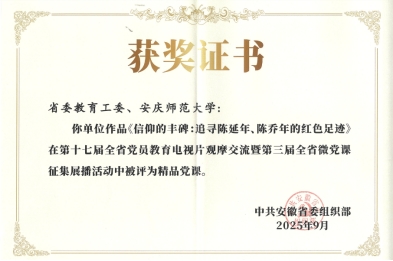 创作的党课视频《信仰的丰碑:追寻陈延年、陈乔年的红色足迹》在第十七届全省党员教育电视片观摩交流暨第三届全省微党课征集展播活动中被评为精品党课。全省仅4所高校报送的党课获评精品党课。