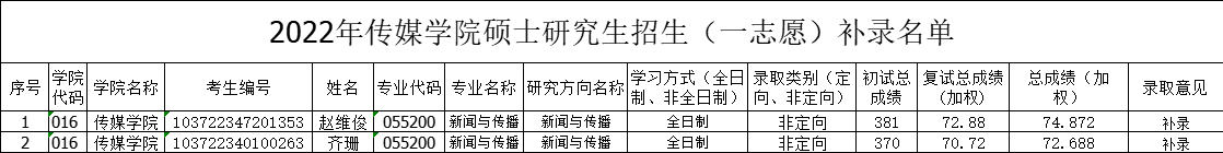 根据学校研究生招生工作领导小组决定,糖心视频 新闻与传播专业调控增加2名招生指标,根据《糖心视频 2022年硕士研究生招生复试录取办法》《糖心视频 学院2022年硕士研究生招生复试录取工作实施细则》等文件要求,现决定按成绩递补拟录取2名考生,现公示如下,公示时间从2022年4月20日开始,公示为期10天。如有问题,请及时向学校研究生复试录取督查组反映,电话:0556-5300053,邮箱:[email protected]。