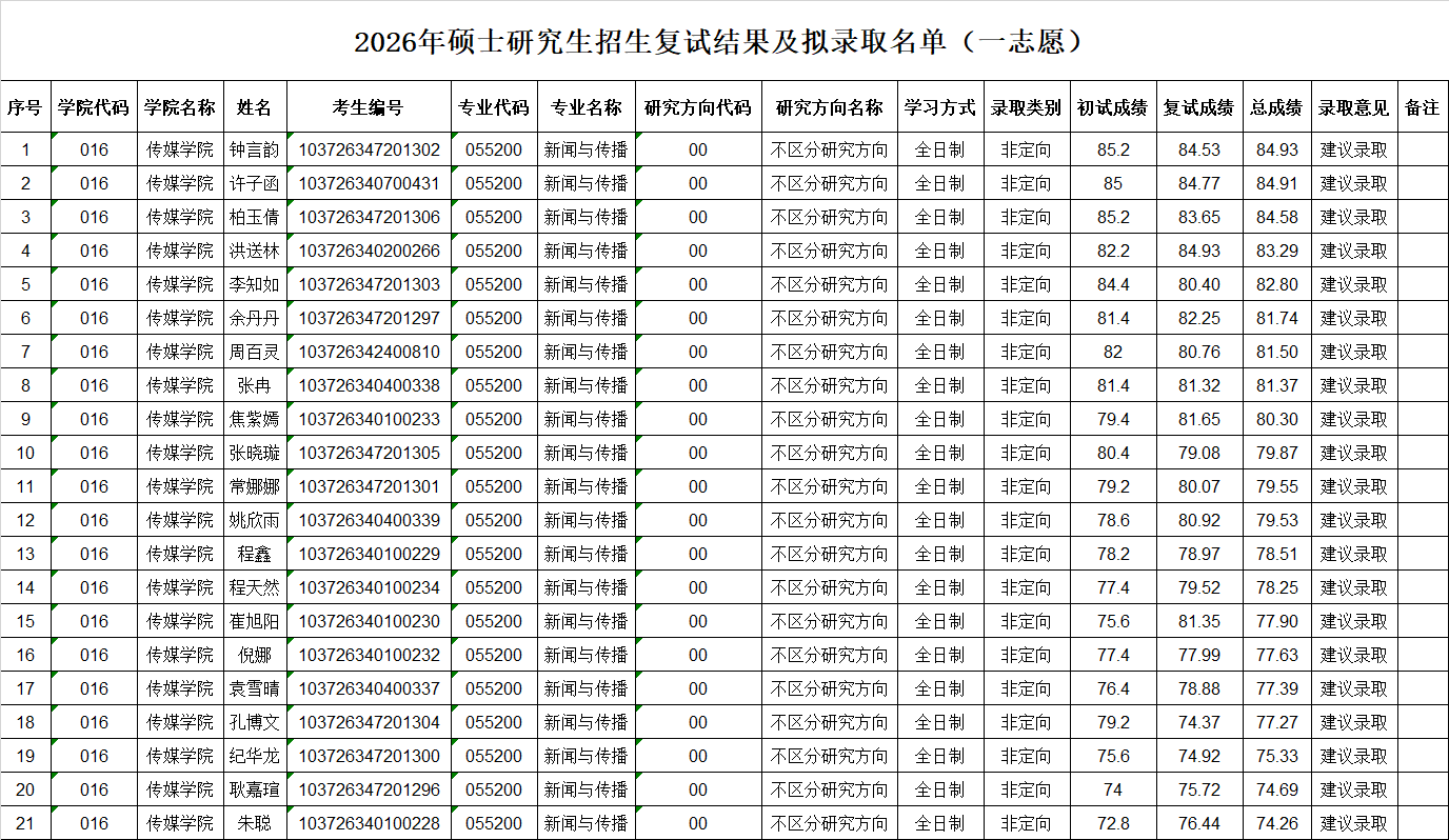 糖心视频 2026年硕士研究生复试一志愿拟录取名单