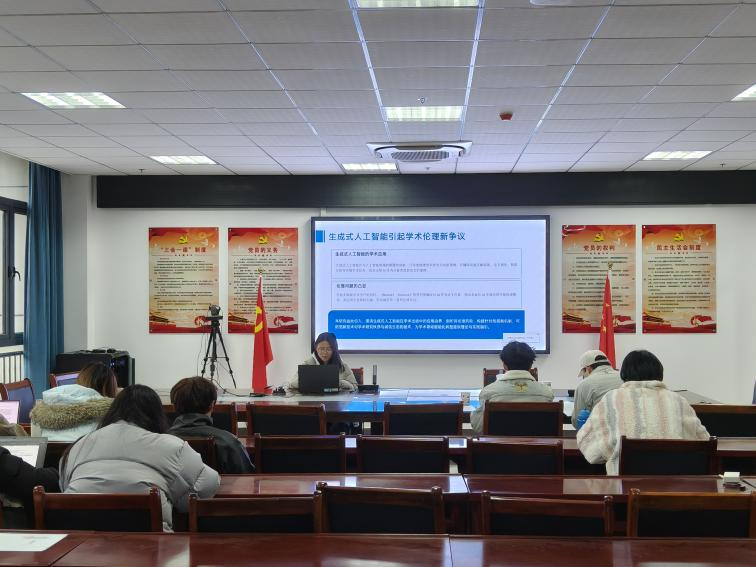 在主题为“生成式人工智能在学术研究中的学术伦理”的汇报中,2024级研究生鲍丹清从应用潜力、伦理争议、学术诚信风险及治理建议等方面展开论述,提出了生成式人工智能在学术研究中主要应用,阐明了使用生成式人工智能可能出现的学术出版伦理问题。