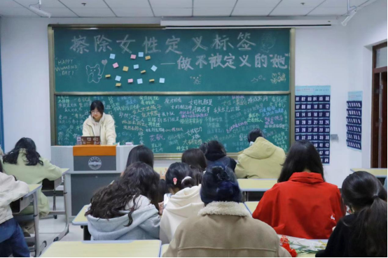 在K102教室举办“擦拭女性标签,送上暖心寄语”活动,学生们将黑板上关于女性不恰当的标签抹去,一次温暖且有力的隔空对话活动吸引了百余名学生参与其中。
