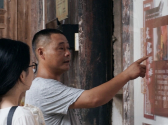 图为村书记向实践团成员讲述舞狮灯的历史