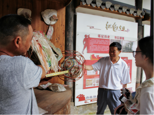 图为实践团成员在村书记带领下参观了解舞狮的工具
