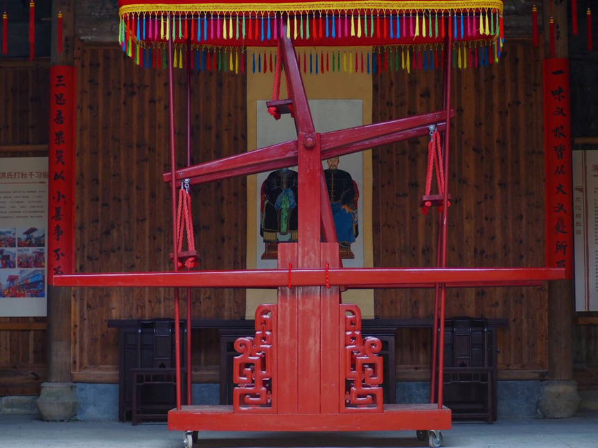 非物质文化遗产,背后不仅浓缩着一方水土的味道,更映照着普通人的奋斗故事和一代代人的家国记忆。在1912年,受环境等因素影响,非遗民俗表演“打秋千”停办了将近50年,后来被当地村民重新挖掘,现在每逢春节及元宵节,三阳村内都会举办“打秋千、扮地戏、跳加官、走五猖”等庆祝活动,非遗传承人用实际行动诠释着古老文化精髓,表达着对传统技艺的热爱。怀着对非遗传承人的崇高敬意,实践团参观了秋千展览馆,了解秋千的制作工艺并记录秋千的设计特点,如其独特的交叉结构和能够自由旋转的功能。
