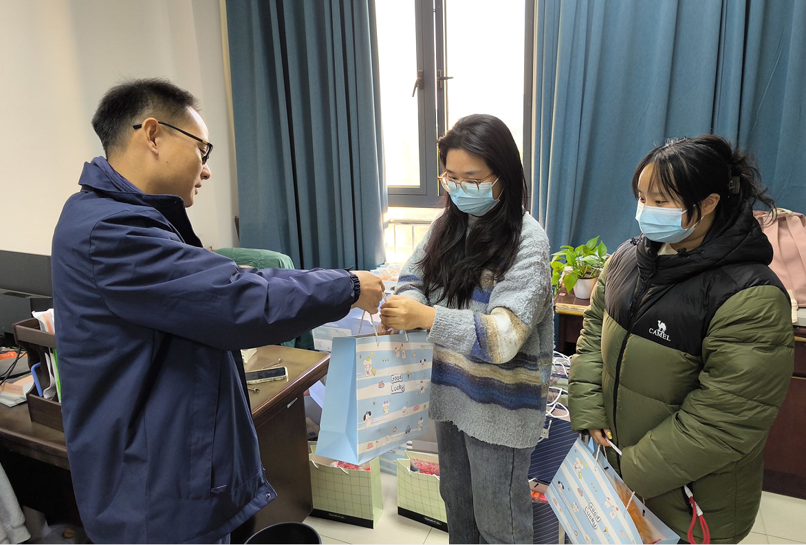 在K409办公室为学院150名考研学子发放暖心大礼包。