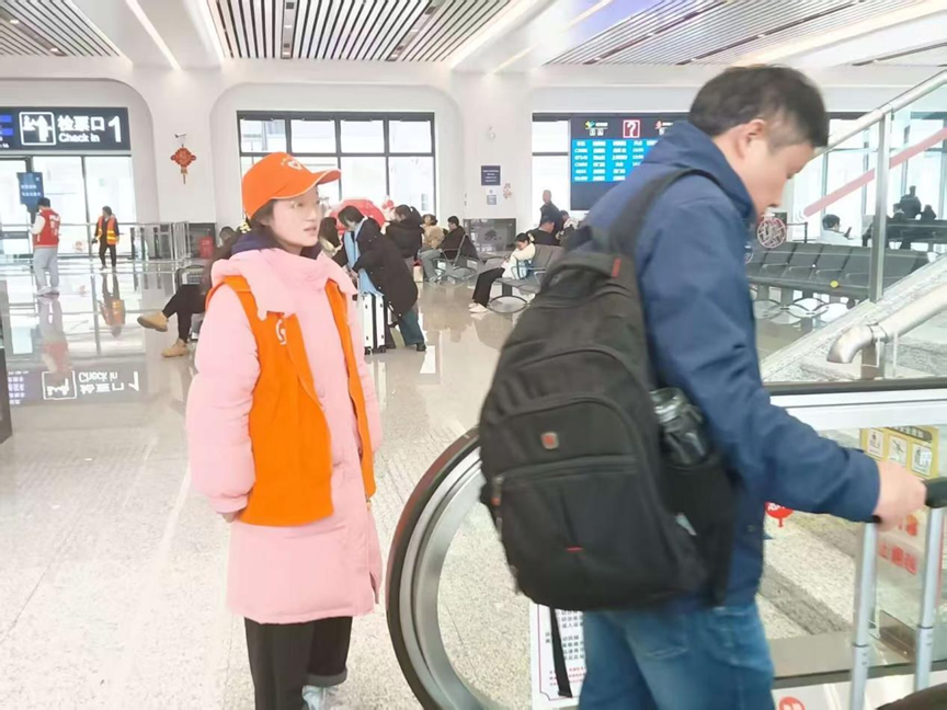 传媒微光志愿队的代表,新闻传播学类专业2024(1)班程圣冉被安排在扶梯旁进行志愿服务,引导旅客,维持正常的候车上车秩序。
