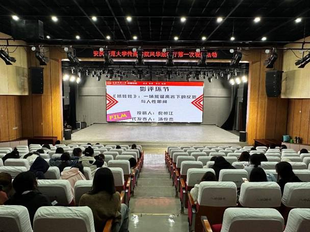 演播厅顺利举行。 新闻传播大讲堂视频播放结束后,演播厅内悄然暗下灯光,电影《抓娃娃》的精彩镜头将百余名观影学生笼罩在流动的光影中。座椅间偶尔闪过笔记本屏幕的微光,是学生低头速记镜头的剪影。 电影结束后,灯光渐亮,影评环节随即开始。