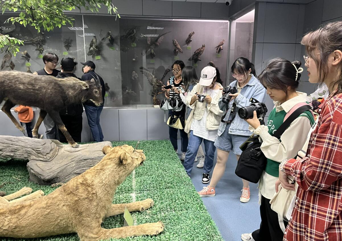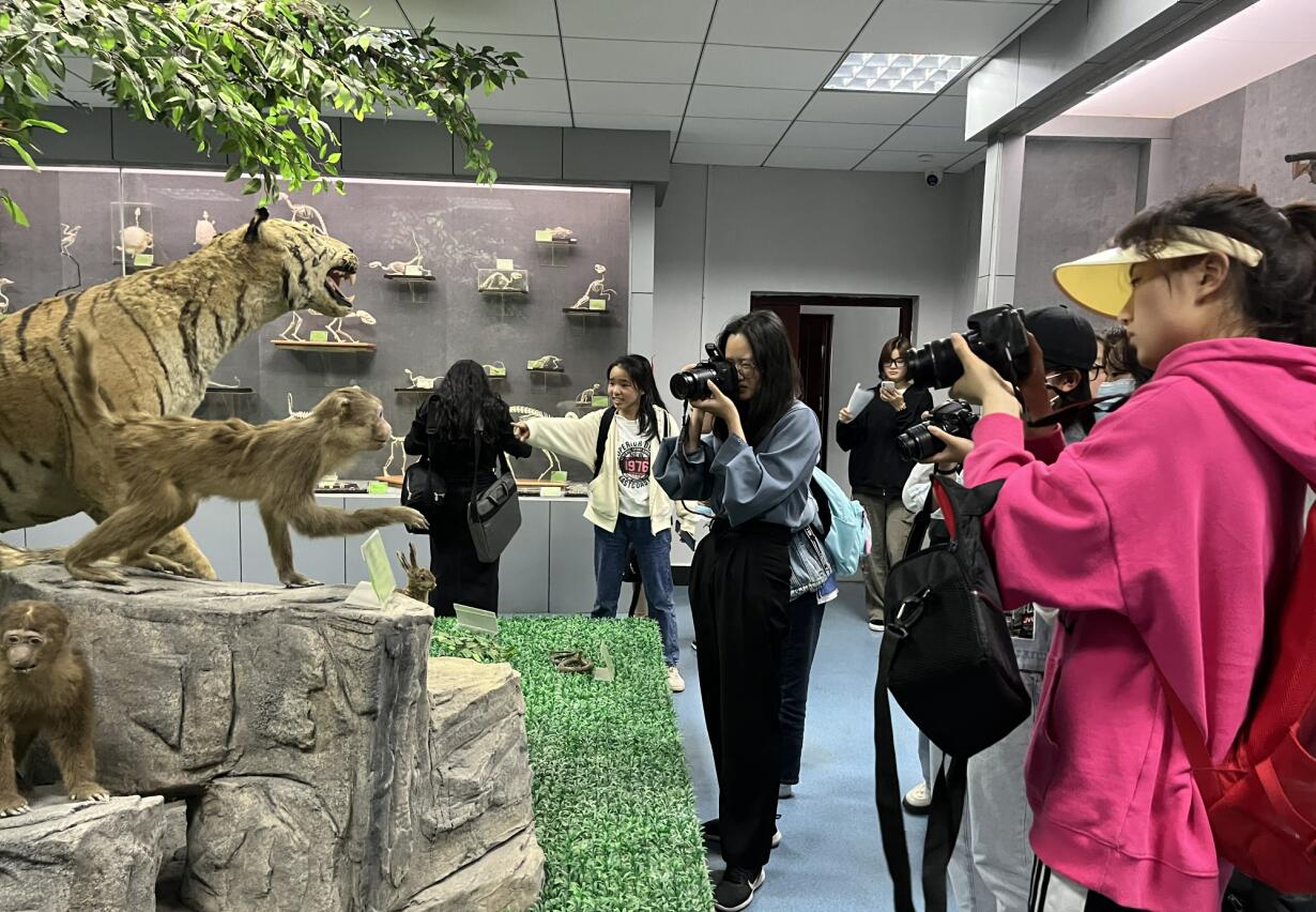 “相较于教室的理论课,我更喜欢走出教室的实践教学,大家在欢乐轻松的氛围下,能学到很多知识。”新闻传播学类专业2021(4)班的高欣雨表示,理论课多在教室且重点是课本,因此拍摄环境较为局限,但标本馆的陈设模拟自然风光,可以让她用心感受、用心拍摄。
