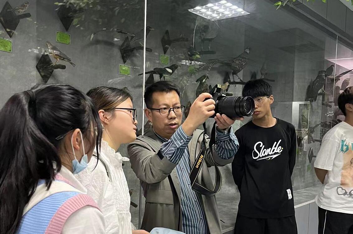 “老师,请问一下室内如何调亮光线?”“老师,拍标本构图怎么才合理呀?”……面对同学们的提问,《新闻摄影》任课老师雒有谋,用相机给学生们操作演示,将课堂搬进标本展馆,同学们纷纷表示,这样的课真是收获满满!
